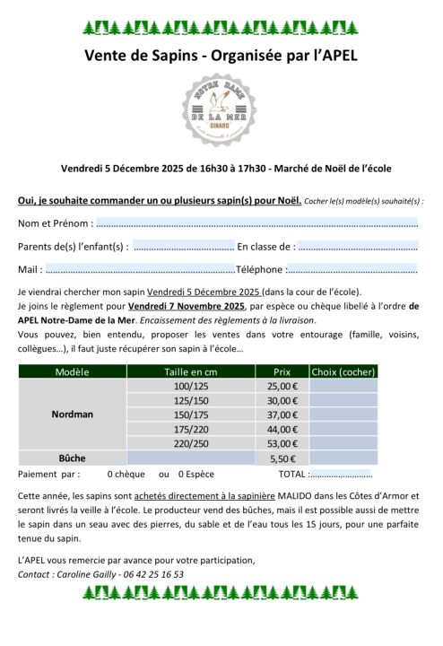Les sapins seront à récupérer le vendredi 5 décembre, jour du marché de Noël après la classe.